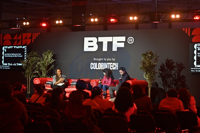 In conversation from ( L to R) Adetola Adeleke, Payal Jain and Mark Tiley at BlackTechFest 2025 on 9th October 2025, Drumsheds London, UK, Credit:Thepinkrosephotographyltd / Avalon