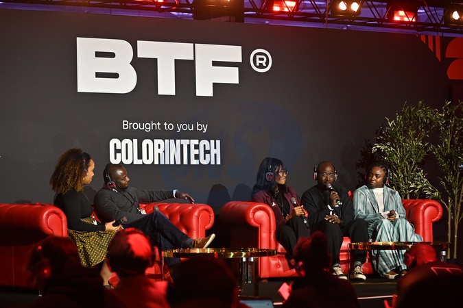 In conversation from ( L to R) Nakita Austin, Femi Popoola, Somto Nwododo, Samuel Esilaba and Ope Fajemirokun at BlackTechFest 2025 on 9th October 2025, Drumsheds London, UK, Credit:Thepinkrosephotographyltd / Avalon
