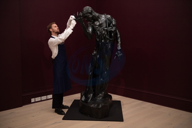 An Art handler adjusts 'Pierre de Wiessant, vêtu, Grand Modèle ' by Auguste Rodin (est. £600k - £900k) which is going on public view ahead of auctions on 16th - 17th October as part of Sotheby's Frieze Week Auctions - Sotheby's, London, England, UK on Friday 10 October, 2025., Credit:Justin Ng / Avalon