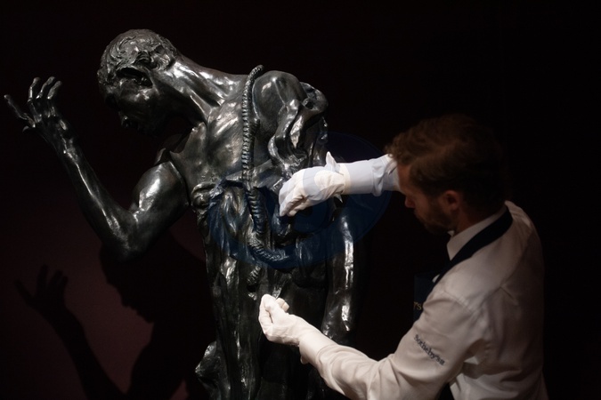 An Art handler adjusts 'Pierre de Wiessant, vêtu, Grand Modèle ' by Auguste Rodin (est. £600k - £900k) which is going on public view ahead of auctions on 16th - 17th October as part of Sotheby's Frieze Week Auctions - Sotheby's, London, England, UK on Friday 10 October, 2025., Credit:Justin Ng / Avalon