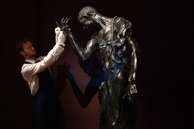 An Art handler adjusts 'Pierre de Wiessant, vêtu, Grand Modèle ' by Auguste Rodin (est. £600k - £900k) which is going on public view ahead of auctions on 16th - 17th October as part of Sotheby's Frieze Week Auctions - Sotheby's, London, England, UK on Friday 10 October, 2025., Credit:Justin Ng / Avalon
