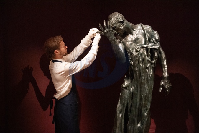 An Art handler adjusts 'Pierre de Wiessant, vêtu, Grand Modèle ' by Auguste Rodin (est. £600k - £900k) which is going on public view ahead of auctions on 16th - 17th October as part of Sotheby's Frieze Week Auctions - Sotheby's, London, England, UK on Friday 10 October, 2025., Credit:Justin Ng / Avalon