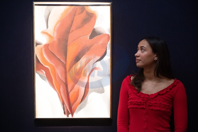 A staff member views 'Large Dark Red Leaves On White' by Georgia O'Keeffe (est. $6m - $8m USD) which is going on public view ahead of auctions on 16th - 17th October as part of Sotheby's Frieze Week Auctions - Sotheby's, London, England, UK on Friday 10 October, 2025., Credit:Justin Ng / Avalon