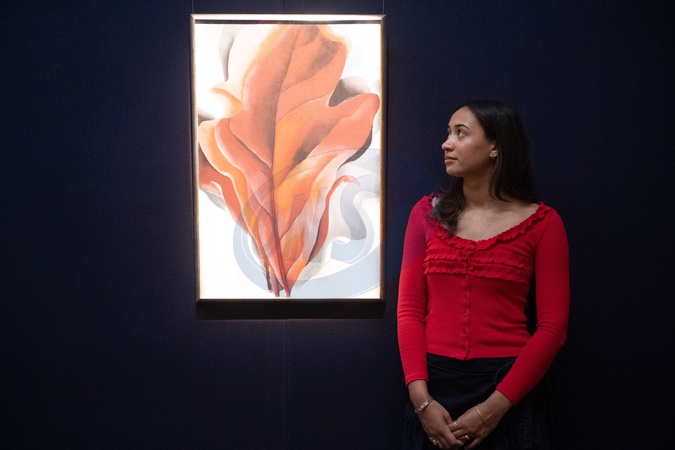 A staff member views 'Large Dark Red Leaves On White' by Georgia O'Keeffe (est. $6m - $8m USD) which is going on public view ahead of auctions on 16th - 17th October as part of Sotheby's Frieze Week Auctions - Sotheby's, London, England, UK on Friday 10 October, 2025., Credit:Justin Ng / Avalon