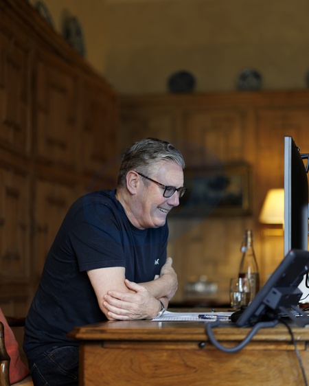 10/10/2025. Ellesborough, United Kingdom. Prime Minister Keir Starmer speaks with German Chancellor Friedrich Merz and French President Emmanuel Macron during an E3 Leaders call from his office in Chequers., Credit:Lauren Hurley / Avalon