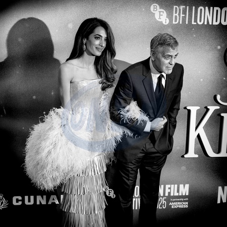 George Clooney and Amal Clooney attends the BFI London Film Festival; the UK premiere of JAY KELLY on Friday 10 October 2025 at Royal Festival Hall, London. Editors Note: Image converted to monochrome., Credit:Julie Edwards / Avalon