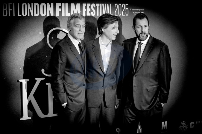 George Clooney, Adam Sandler and Noah Baumbach attends the BFI London Film Festival; the UK premiere of JAY KELLY on Friday 10 October 2025 at Royal Festival Hall, London. Editors Note: Image converted to monochrome., Credit:Julie Edwards / Avalon