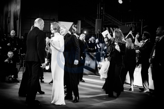 Yorgos Lanthimos, Emma Stone and Jesse Plemons attends the BFI London Film Festival; the UK premiere of BUGONIA on Friday 10 October 2025 at Royal Festival Hall, London. Editors Note: Image converted to monochrome., Credit:Julie Edwards / Avalon