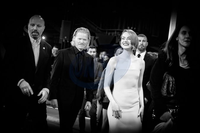 Yorgos Lanthimos, Emma Stone and Jesse Plemons attends the BFI London Film Festival; the UK premiere of BUGONIA on Friday 10 October 2025 at Royal Festival Hall, London. Editors Note: Image converted to monochrome., Credit:Julie Edwards / Avalon