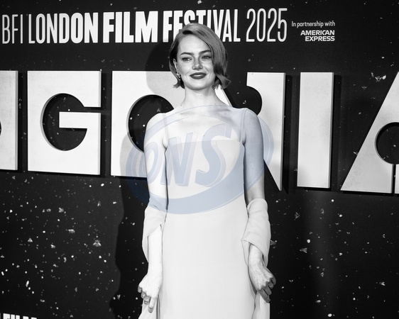 Emma Stone attends the BFI London Film Festival; the UK premiere of BUGONIA on Friday 10 October 2025 at Royal Festival Hall, London. Editors Note: Image converted to monochrome., Credit:Julie Edwards / Avalon