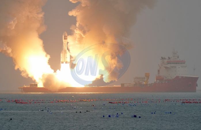 Orienspace, a private space company, launches its Gravity-1 rocket — currently the world's most powerful solid-propellant launch vehicle with a low-Earth orbit carrying capacity of 6.5 tonnes — from a ship off the coast of Haiyang in east China's Shandong province Saturday, Oct. 11, 2025., Credit:TANG KE / Avalon
