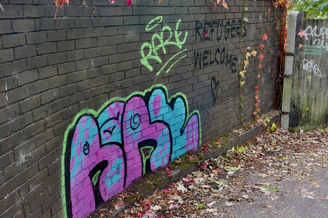Refugees welcome spray painted on a wall by Kings Meadow., Credit:Geoffrey Swaine / Avalon