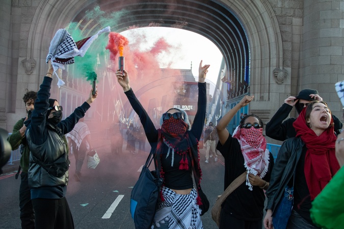 London, UK, 11th October 2025 - Youth Demand Protestors block traffic on Tower Bridge for 15-20 minutes, demanding justice for Palestine, before being arrested by Metropolitan Police under Section Seven of the Public Order act., Credit:Will Colebourne / Avalon
