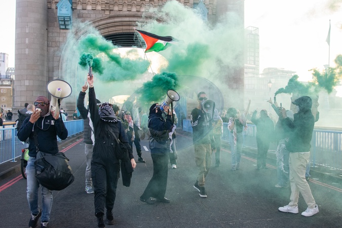 London, UK, 11th October 2025 - Youth Demand Protestors block traffic on Tower Bridge for 15-20 minutes, demanding justice for Palestine, before being arrested by Metropolitan Police under Section Seven of the Public Order act., Credit:Will Colebourne / Avalon