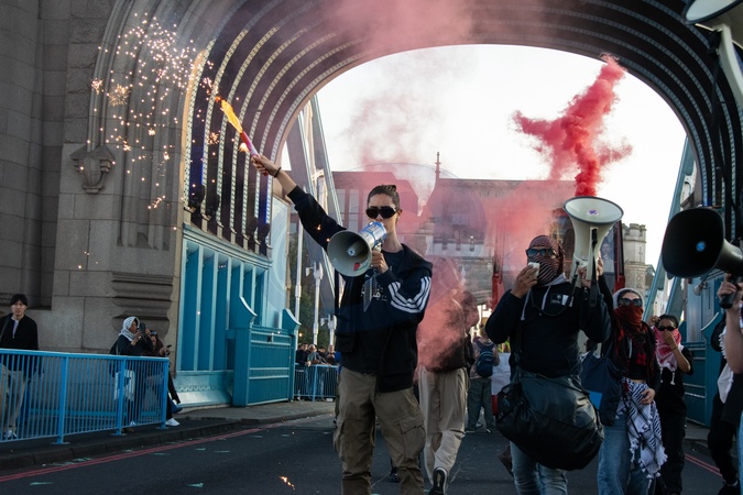 London, UK, 11th October 2025 - Youth Demand Protestors block traffic on Tower Bridge for 15-20 minutes, demanding justice for Palestine, before being arrested by Metropolitan Police under Section Seven of the Public Order act., Credit:Will Colebourne / Avalon