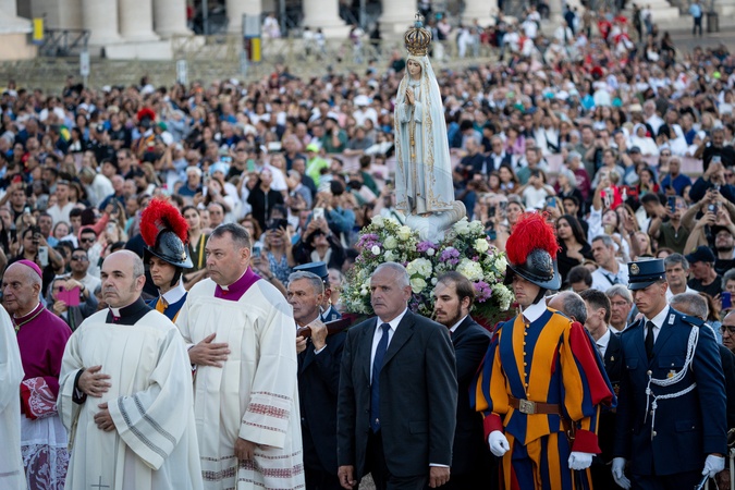 The statue of Our Lady of Fatima is carried to St. Peter's square before the arrival of Pope Leo XIV to preside over a Rosary vigil for peace on the 63rd anniversary of the start of the Second Vatican Council in St. Peter's Square in Vatican City, Vatican, on 11 October 2025., Credit:Stefano Costantino TTL / Avalon