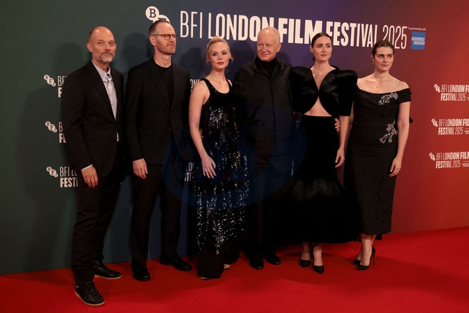 Eskil Vogt, Joachim Trier, Elle Fanning, Stellan Skarsgard, Renate Reinsve and Inga Ibsdotter Lilleaas at Sentimental Value premiere, 69th BFI London Film Festival, UK, on 12th October 2025, Credit:James Shaw / Avalon