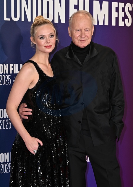 Elle Fanning and Stellan Skarsgĺrd attends "Sentimental Value" Premiere during the BFI London Film Festival, at the Southbank Centre, Royal Festival Hall in London, England. UK. Sunday 12th October 2025, Credit:James Warren / Avalon