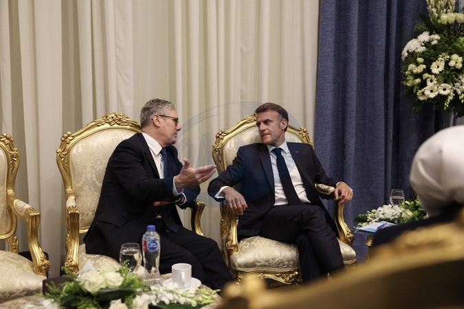 13/10/2025. Sharm El-Sheikh, Egypt. Prime Minister Keir Starmer speaks meets with French President Emmanuel Macron as he attends the Sharm El-Sheikh peace summit at the Sharm El-Sheikh International Convention Centre where the peace plan for Gaza will be signed., Credit:Lauren Hurley / Avalon