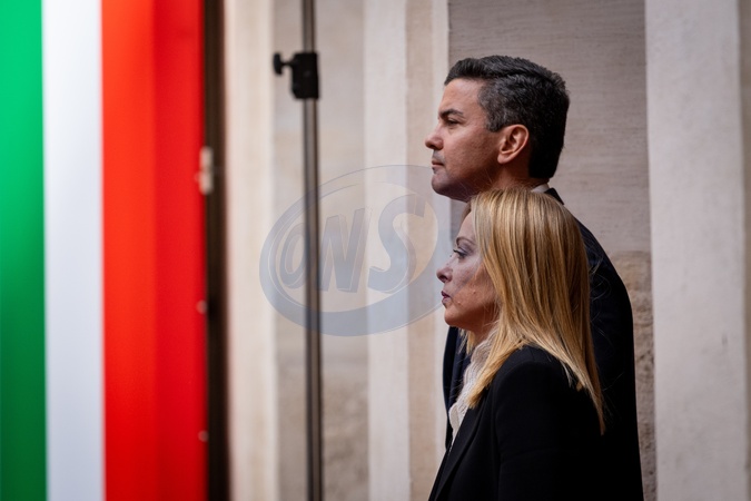 Italian Prime Minister Giorgia Meloni receives the President of Paraguay, Santiago Peña Palacios at Palazzo Chigi in Rome, Italy on 14 October 2025.