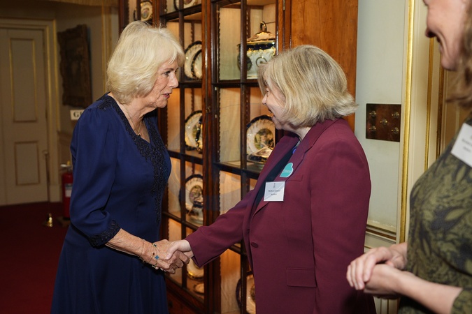 Queen Camilla with Diana Gerald during a reception to celebrate the centenary of BookTrust, at Clarence House, London. Picture date: Tuesday October 14, 2025., Credit:Aaron Chown / Avalon
