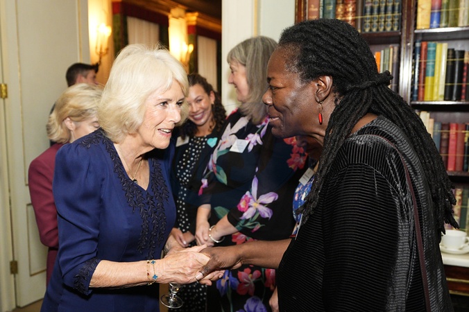 Queen Camilla speaking with Ann Graham from the Association of Directors of Children Services during a reception to celebrate the centenary of BookTrust, at Clarence House, London. Picture date: Tuesday October 14, 2025., Credit:Aaron Chown / Avalon