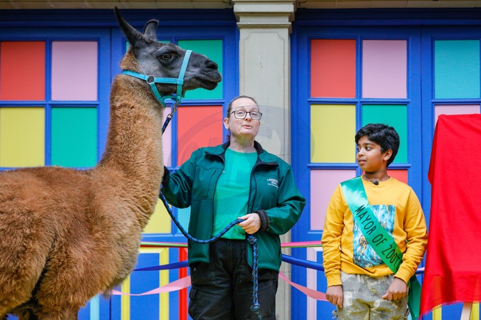London, UK. 15th Oct 2025. TV presenter and young wildlife enthusiast Aneeshwar Kunchala with Ande, London Zoo's 11-year-old llama, who joins as guest of honour with Keeper Amanda for the reveal of the ZooTown sign. ZooTown features themed role-play stations where children can try their hands at activities. The mini conservation zoo is designed to inspire and empower the next generation of conservationists. Open to the public from 18th Oct., Credit:Imageplotter / Avalon