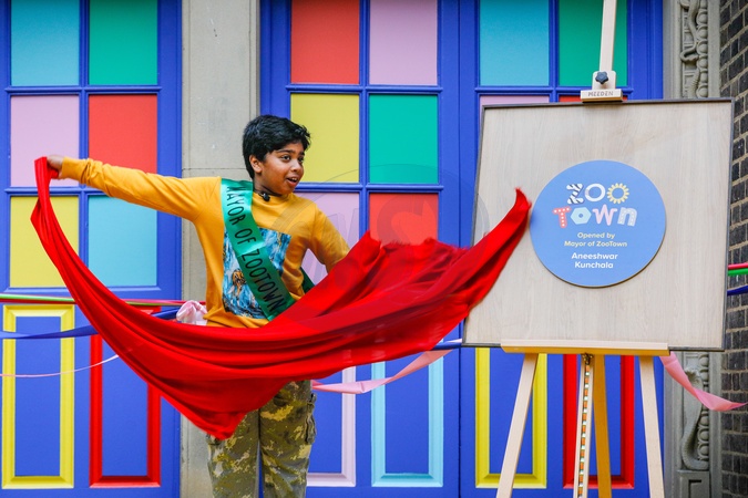 London, UK. 15th Oct 2025. TV presenter and young wildlife enthusiast Aneeshwar Kunchala reveals the entrance sign. ZooTown features themed role-play stations where children can try their hands at activities. The mini conservation zoo is designed to inspire and empower the next generation of conservationists. Open to the public from 18th Oct., Credit:Imageplotter / Avalon