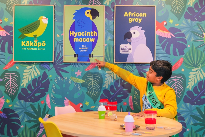 London, UK. 15th Oct 2025. TV presenter and young wildlife enthusiast Aneeshwar Kunchala looks at parrot and macaw displays in a colourful little sitting area. ZooTown features themed role-play stations where children can try their hands at activities. The mini conservation zoo is designed to inspire and empower the next generation of conservationists. Open to the public from 18th Oct., Credit:Imageplotter / Avalon
