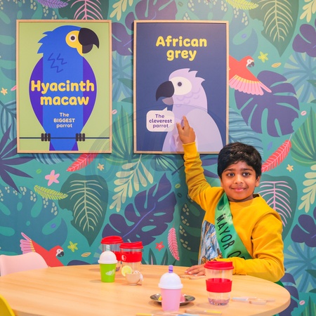 London, UK. 15th Oct 2025. TV presenter and young wildlife enthusiast Aneeshwar Kunchala looks at parrot and macaw displays in a colourful little sitting area. ZooTown features themed role-play stations where children can try their hands at activities. The mini conservation zoo is designed to inspire and empower the next generation of conservationists. Open to the public from 18th Oct., Credit:Imageplotter / Avalon