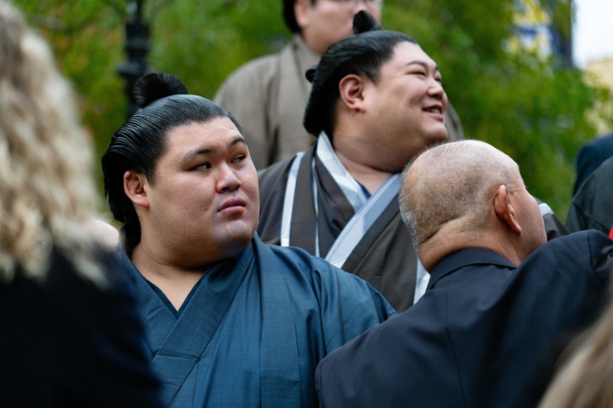 The rikishi participating in The Grand Sumo Tournament, alongside representatives from the Japan Sumo Association (Sumo Kyokai), are photographed outside the Royal Albert Hall ahead of the tournament commencing this evening. The Grand Sumo Tournament takes place at the Royal Albert Hall between 15–19 October 2025, marking only the second time Japan's iconic sport has visited the UK, following the previous event in 1991. Shot in London, UK, on 15th October 2025., Credit:Oleksii Ovcharenko / Avalon