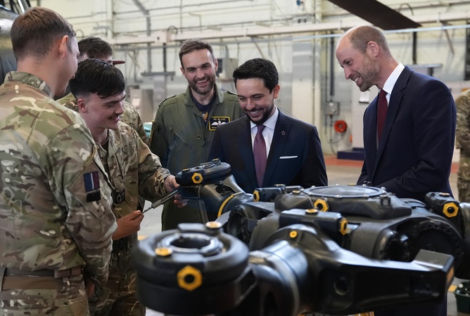 The Prince of Wales (right) and the Crown Prince Hussein of Jordan (2nd right) meet maintenance crew from No. 28 (AC) Sqn during a visit to RAF Benson in Wallingford, Oxfordshire. Picture date: Wednesday October 15, 2025., Credit:Andrew Matthews / Avalon