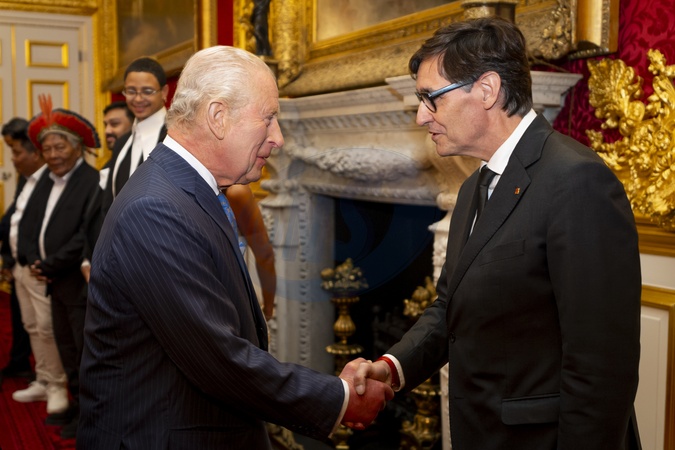 King Charles III greets President of Catalonia Salvador Illa i Roca during a reception for scientists and business and indigenous leaders with the Circular Bioeconomy Alliance, at St James's Palace, London. Picture date: Wednesday October 15, 2025., Credit:Avalon.red / Avalon