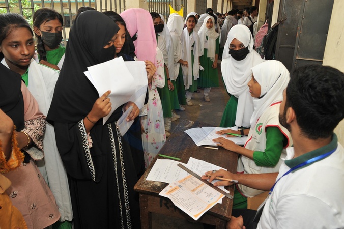 Chattogram, Bangladesh: Student is waititing to get vaccinated against typhoid at Rahmania High School in the city's Hamzar Bagh area. For the first time, Bangladesh has launched a nationwide, government-run typhoid vaccination program, which began on October 12. The campaign aims to immunize about 49 million children and adolescents aged 9 months to 15 years, free of charge, against typhoid., Credit:Md Rafayat Haque Khan / Avalon