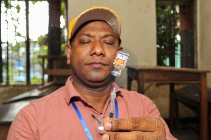Chattogram, Bangladesh: Health staff prepare Typhoid vaccine. For the first time, Bangladesh has launched a nationwide, government-run typhoid vaccination program, which began on October 12. The campaign aims to immunize about 49 million children and adolescents aged 9 months to 15 years, free of charge, against typhoid., Credit:Md Rafayat Haque Khan / Avalon