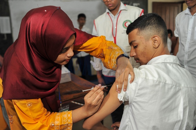 Chattogram, Bangladesh: A student is vaccinated against typhoid at Rahmania High School in the city's Hamzar Bagh area. For the first time, Bangladesh has launched a nationwide, government-run typhoid vaccination program, which began on October 12. The campaign aims to immunize about 49 million children and adolescents aged 9 months to 15 years, free of charge, against typhoid., Credit:Md Rafayat Haque Khan / Avalon