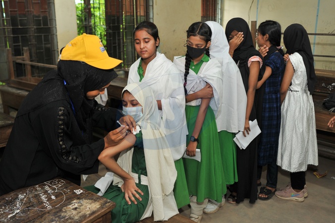 Chattogram, Bangladesh: A student is vaccinated against typhoid at Rahmania High School in the city's Hamzar Bagh area. For the first time, Bangladesh has launched a nationwide, government-run typhoid vaccination program, which began on October 12. The campaign aims to immunize about 49 million children and adolescents aged 9 months to 15 years, free of charge, against typhoid., Credit:Md Rafayat Haque Khan / Avalon