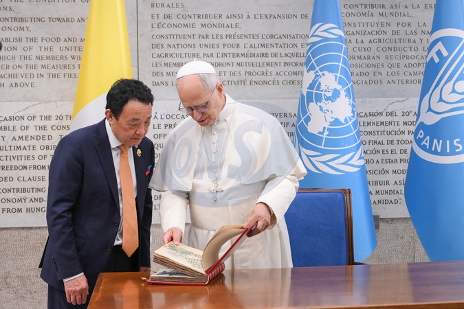 FAO Director General QU Dongyu , Pope Leo XIV during FAO Assembly on the occasion of World Food Day and the 80th anniversary of its foundation, Rome, Italy 16 Oct 2025, Credit:Maria Laura Antonelli / Avalon