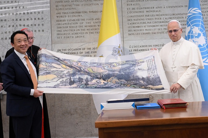 FAO Director General QU Dongyu , Pope Leo XIV during FAO Assembly on the occasion of World Food Day and the 80th anniversary of its foundation, Rome, Italy 16 Oct 2025, Credit:Maria Laura Antonelli / Avalon