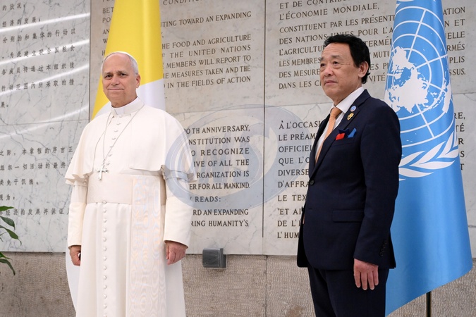 FAO Director General QU Dongyu , Pope Leo XIV during FAO Assembly on the occasion of World Food Day and the 80th anniversary of its foundation, Rome, Italy 16 Oct 2025, Credit:Maria Laura Antonelli / Avalon