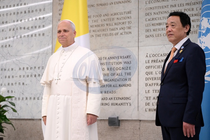 FAO Director General QU Dongyu , Pope Leo XIV during FAO Assembly on the occasion of World Food Day and the 80th anniversary of its foundation, Rome, Italy 16 Oct 2025, Credit:Maria Laura Antonelli / Avalon
