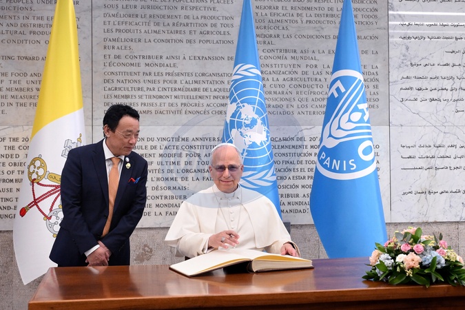 FAO Director General QU Dongyu , Pope Leo XIV during FAO Assembly on the occasion of World Food Day and the 80th anniversary of its foundation, Rome, Italy 16 Oct 2025, Credit:Maria Laura Antonelli / Avalon