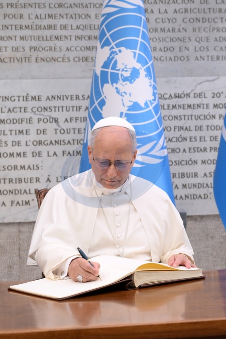 Pope Leo XIV firma il libro delle presenze during FAO Assembly on the occasion of World Food Day and the 80th anniversary of its foundation, Rome, Italy 16 Oct 2025, Credit:Maria Laura Antonelli / Avalon