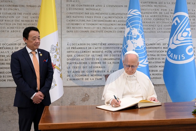 FAO Director General QU Dongyu , Pope Leo XIV during FAO Assembly on the occasion of World Food Day and the 80th anniversary of its foundation, Rome, Italy 16 Oct 2025, Credit:Maria Laura Antonelli / Avalon