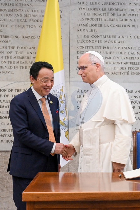FAO Director General QU Dongyu , Pope Leo XIV during FAO Assembly on the occasion of World Food Day and the 80th anniversary of its foundation, Rome, Italy 16 Oct 2025, Credit:Maria Laura Antonelli / Avalon