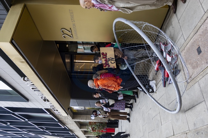 Protesters gathered outside the London Collective Investment Vehicle (LCIV) offices in Central London, calling for the organisation to divest pensions and investments from companies linked to Israel. Demonstrators held placards and banners urging financial accountability and solidarity with Palestinians, demanding that public funds not be used to support the occupation., Credit:Zak Irfan / Avalon