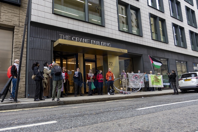 Protesters gathered outside the London Collective Investment Vehicle (LCIV) offices in Central London, calling for the organisation to divest pensions and investments from companies linked to Israel. Demonstrators held placards and banners urging financial accountability and solidarity with Palestinians, demanding that public funds not be used to support the occupation., Credit:Zak Irfan / Avalon