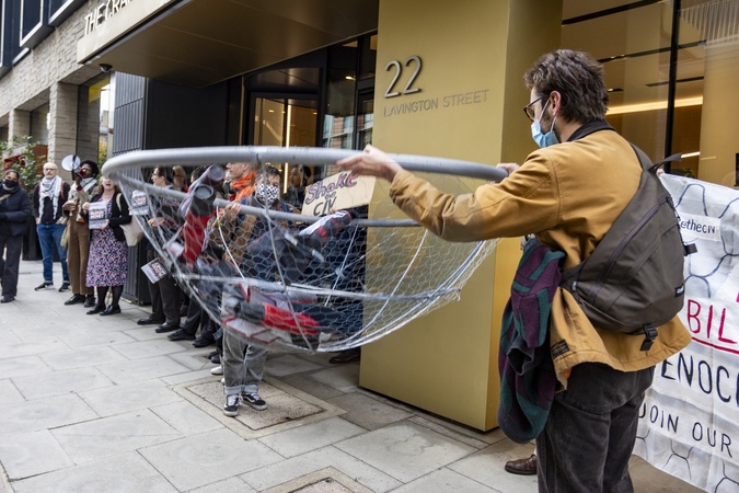 Protesters gathered outside the London Collective Investment Vehicle (LCIV) offices in Central London, calling for the organisation to divest pensions and investments from companies linked to Israel. Demonstrators held placards and banners urging financial accountability and solidarity with Palestinians, demanding that public funds not be used to support the occupation., Credit:Zak Irfan / Avalon