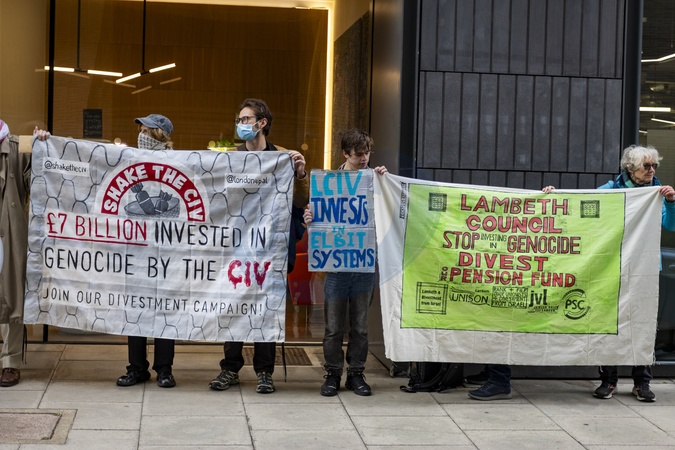 Protesters gathered outside the London Collective Investment Vehicle (LCIV) offices in Central London, calling for the organisation to divest pensions and investments from companies linked to Israel. Demonstrators held placards and banners urging financial accountability and solidarity with Palestinians, demanding that public funds not be used to support the occupation., Credit:Zak Irfan / Avalon