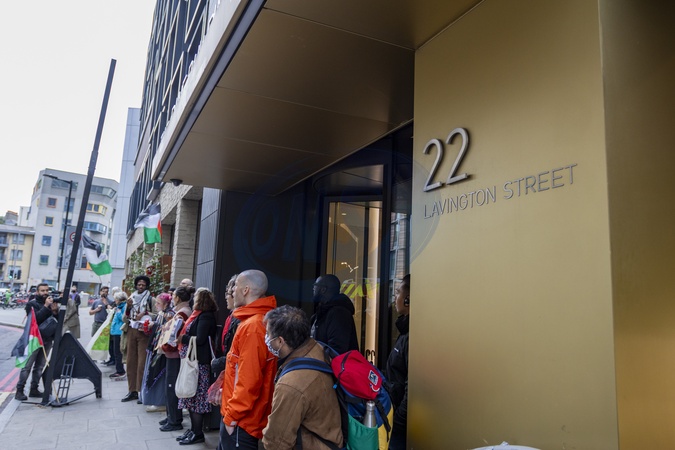 Protesters gathered outside the London Collective Investment Vehicle (LCIV) offices in Central London, calling for the organisation to divest pensions and investments from companies linked to Israel. Demonstrators held placards and banners urging financial accountability and solidarity with Palestinians, demanding that public funds not be used to support the occupation., Credit:Zak Irfan / Avalon